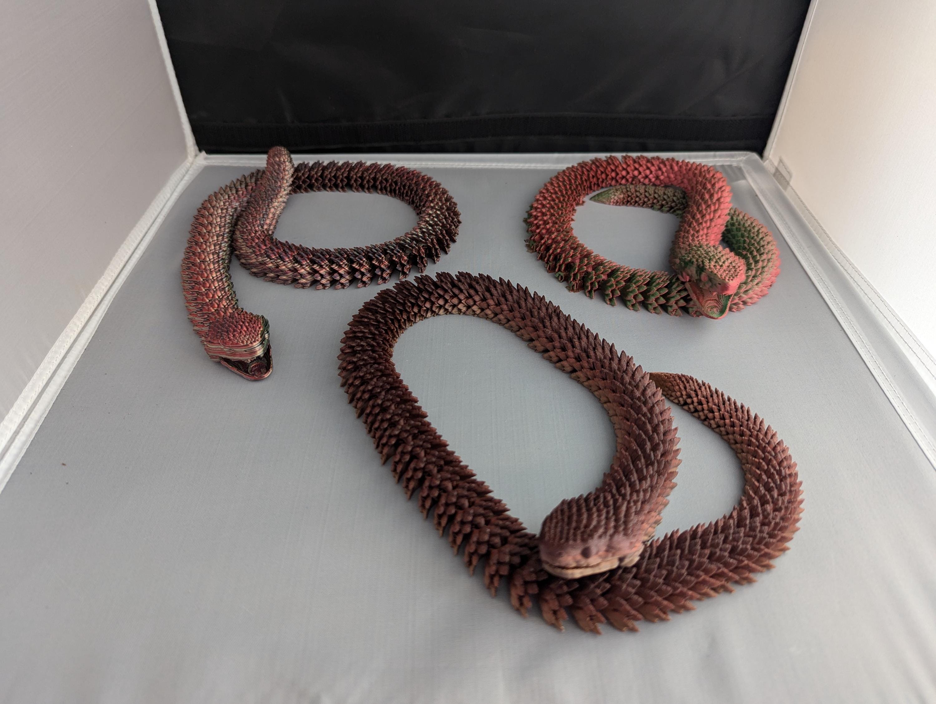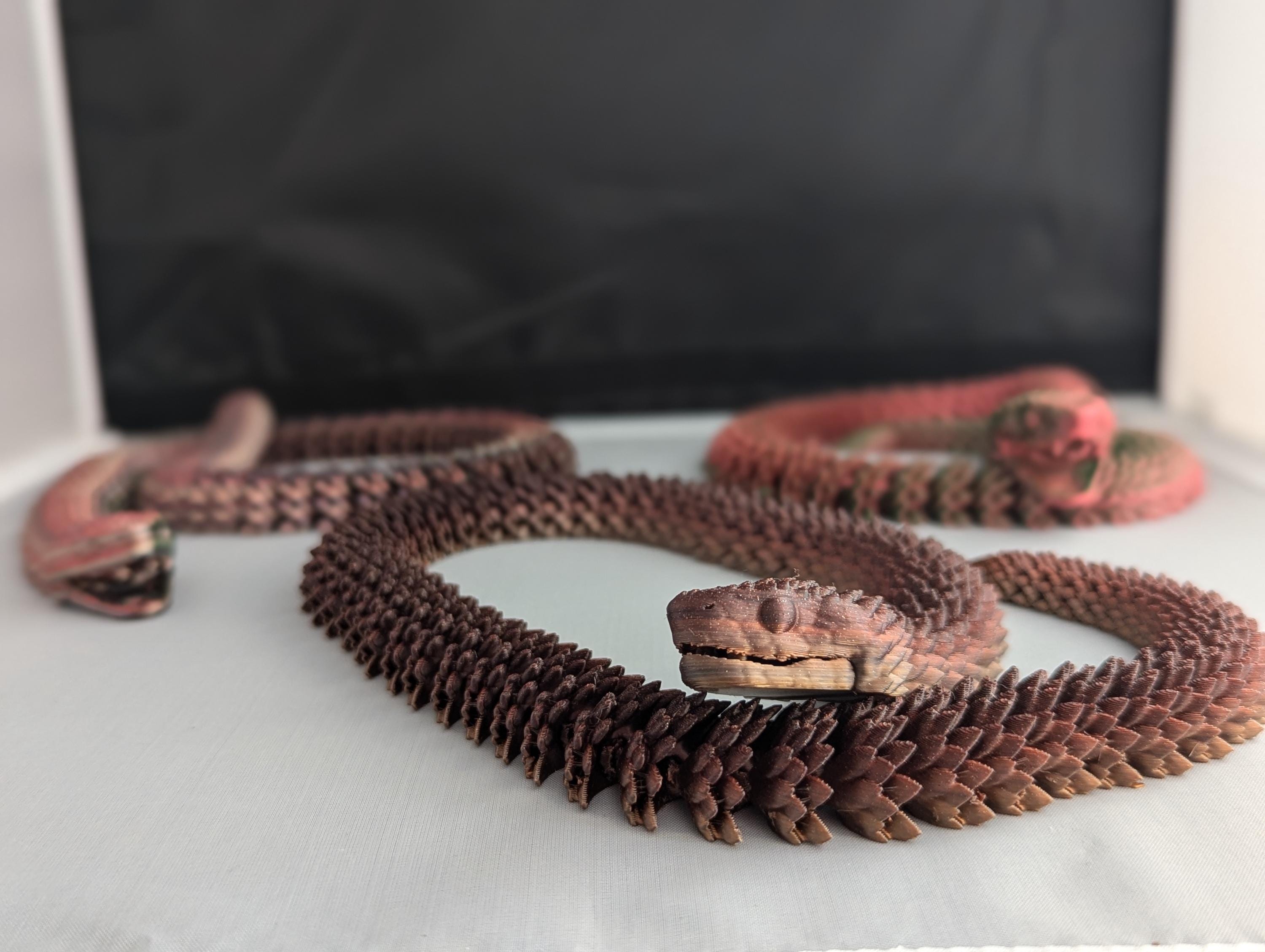 ▬▬▬▬▬▬▬▬▬▬▬▬ FABRICATION ▬▬▬▬▬▬▬▬▬▬▬▬ This articulated snake is 3D printed. All items are printed from PLA Plastic (PLA) filament, a recyclable, natural thermoplastic polyester derived from renewable resources such as corn starch or sugar cane. The filament is biodegradable under certain conditions and has high heat capacity and high mechanical strength.