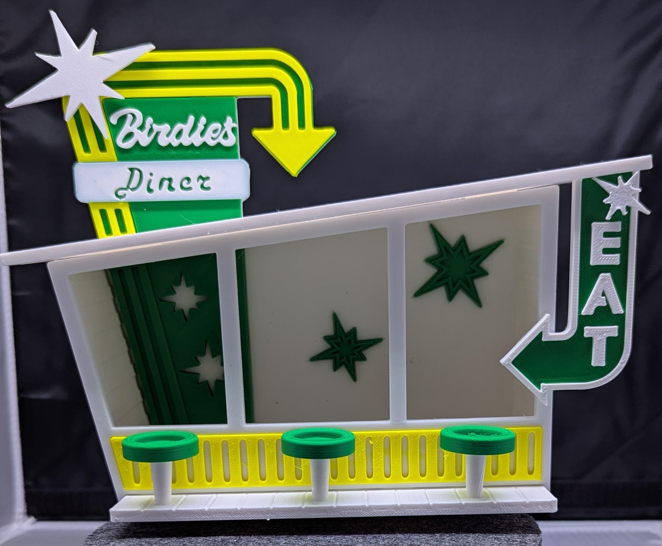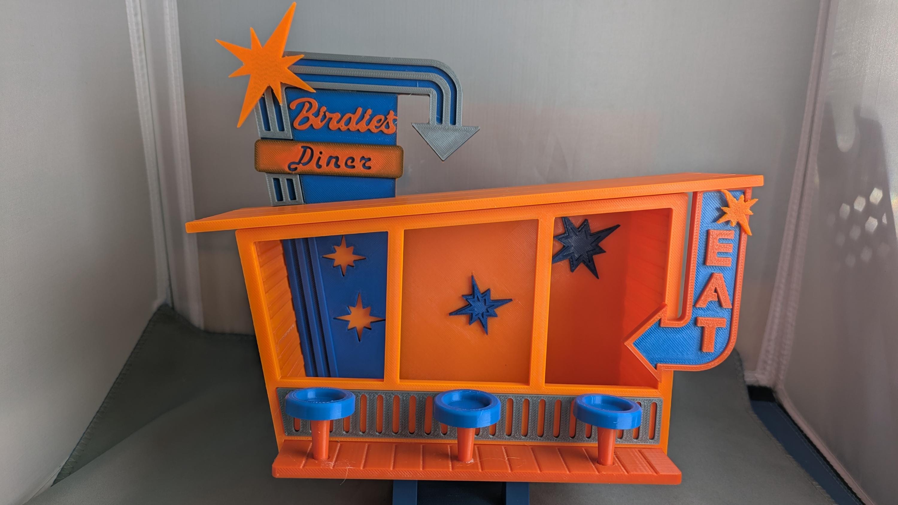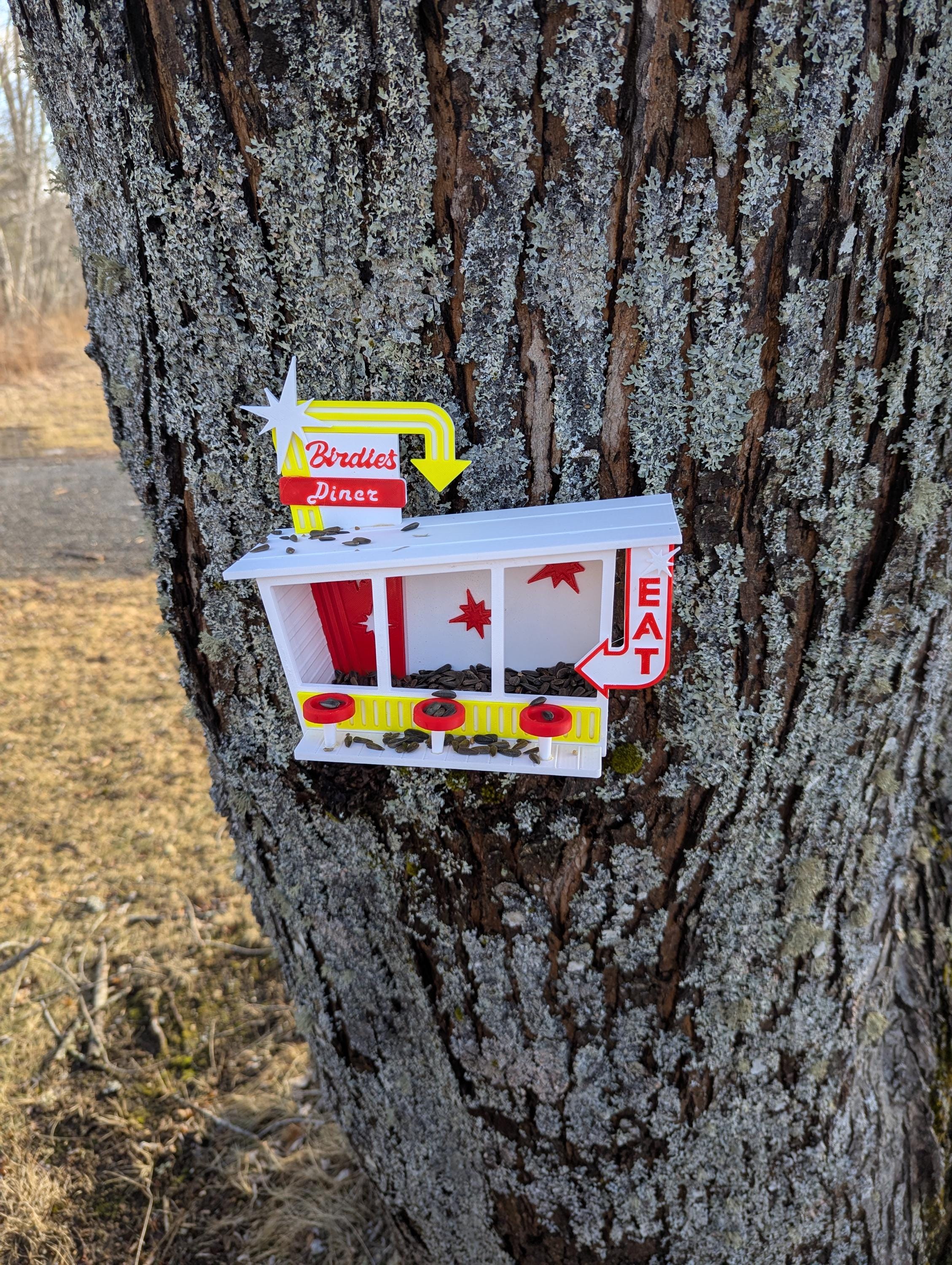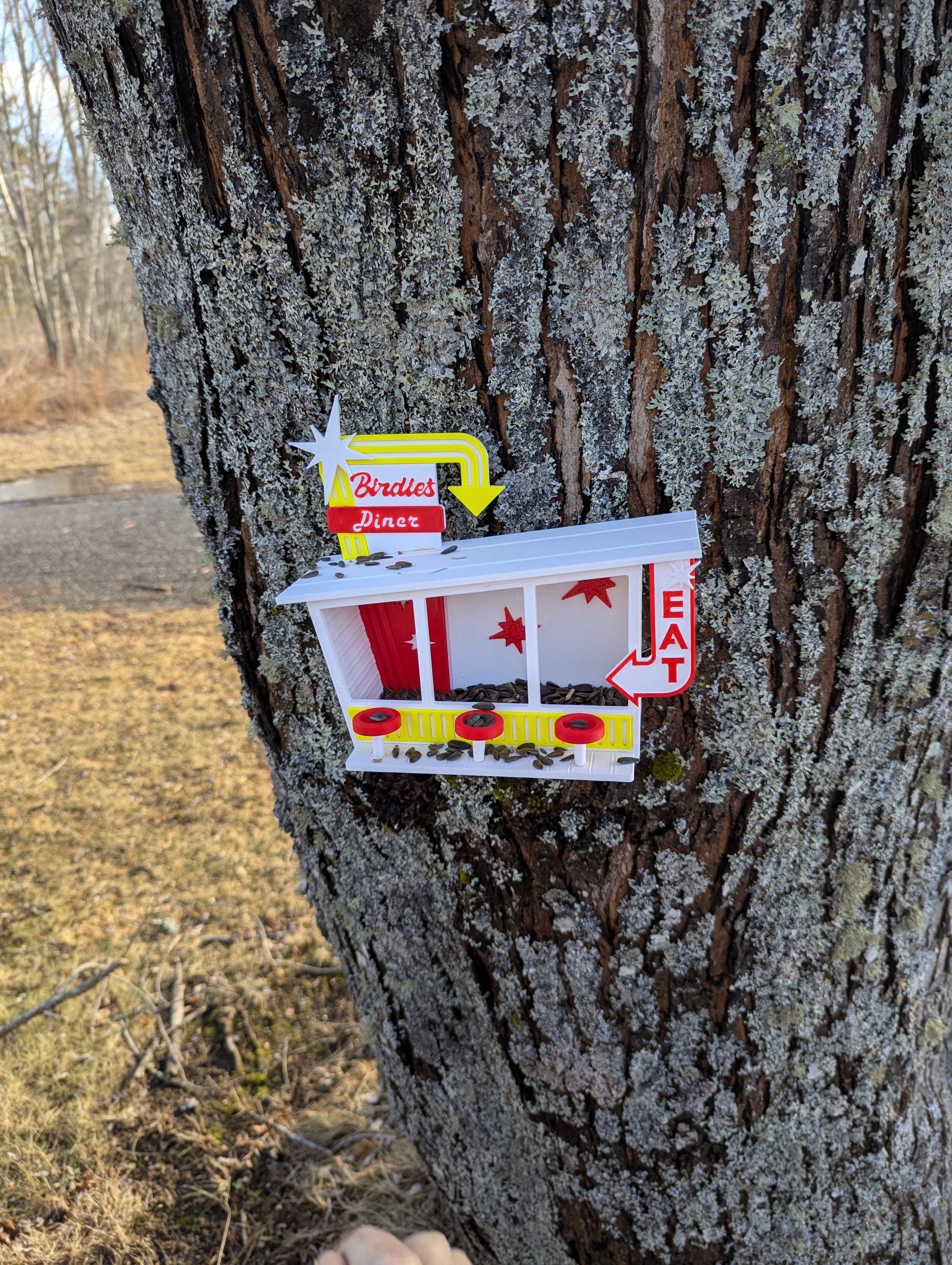 Adorable bird feeder in the style of a retro diner. Comes with seats for three birdy customers and plenty of room for birdseed inside the diner.