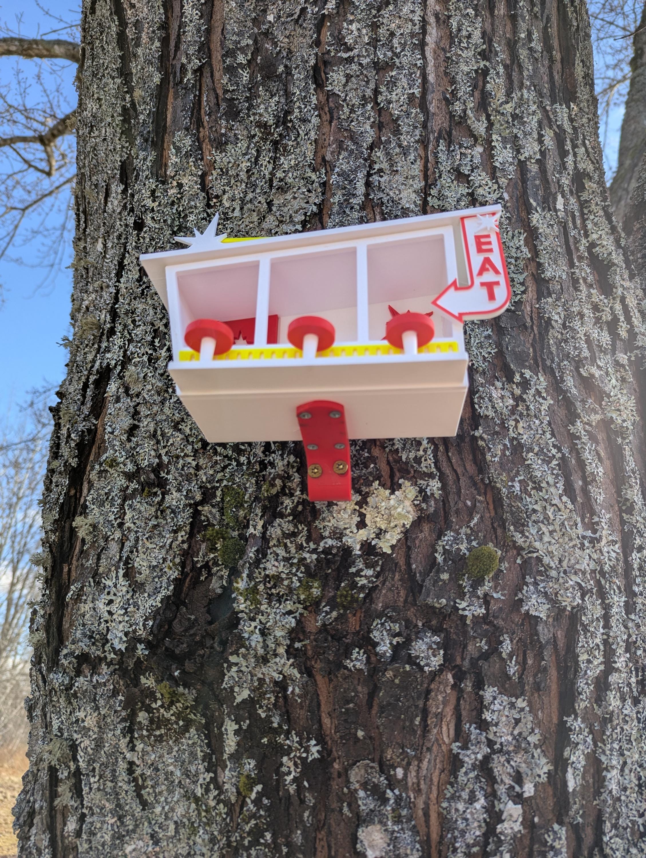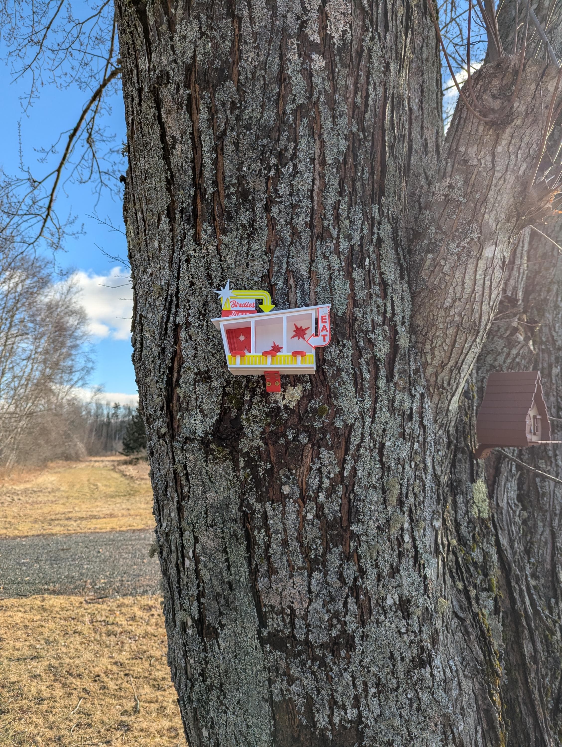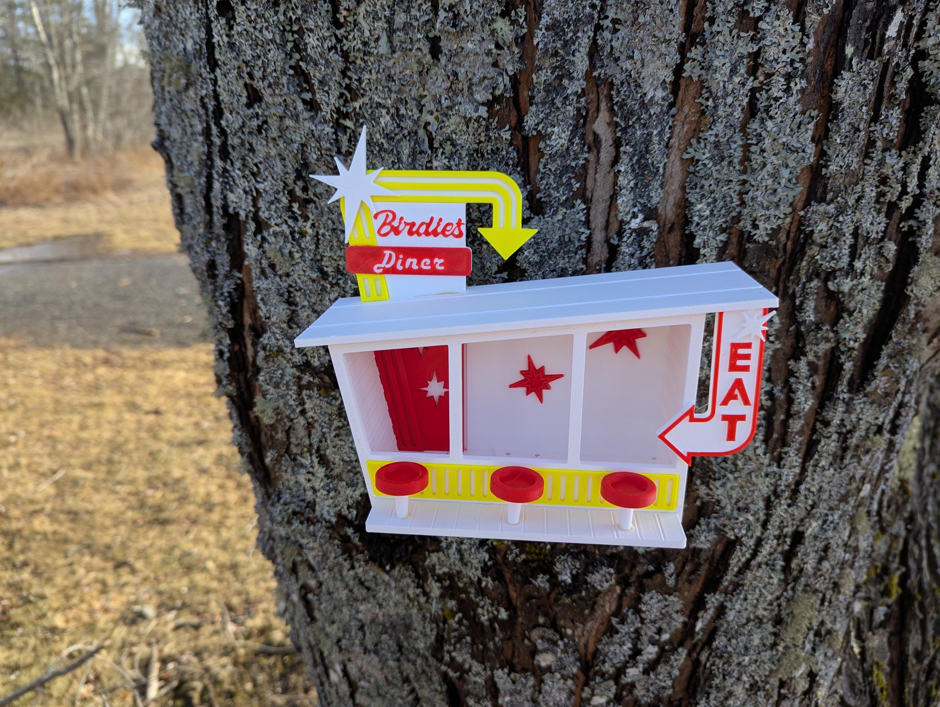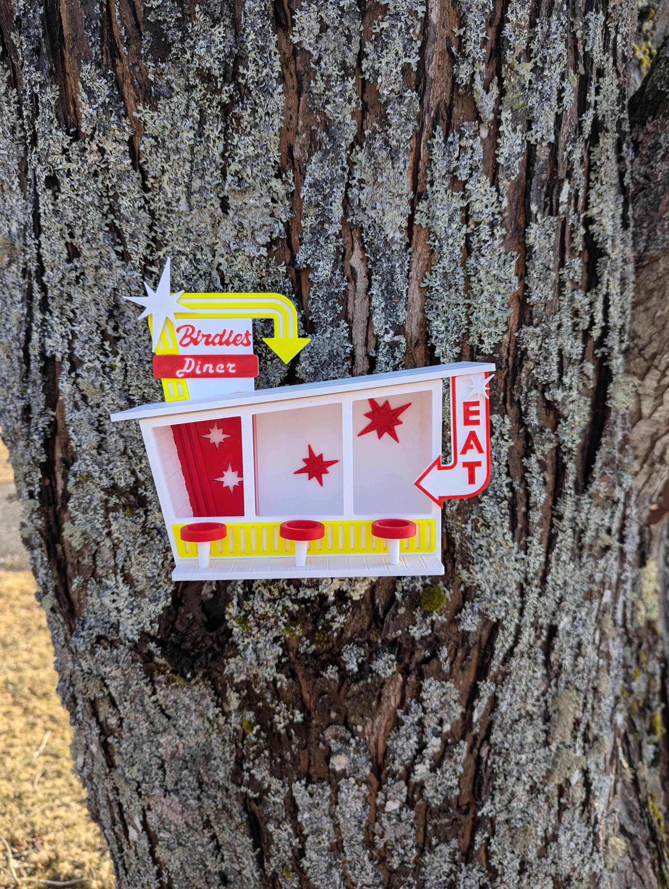 The upper sign proclaims Birdie's Diner while the sign to the right says "EAT." Birds won't be able to resist this bright and attractive backyard eatery. Ideal for small birds. Mounts to a tree or post with two sturdy screws (not included).