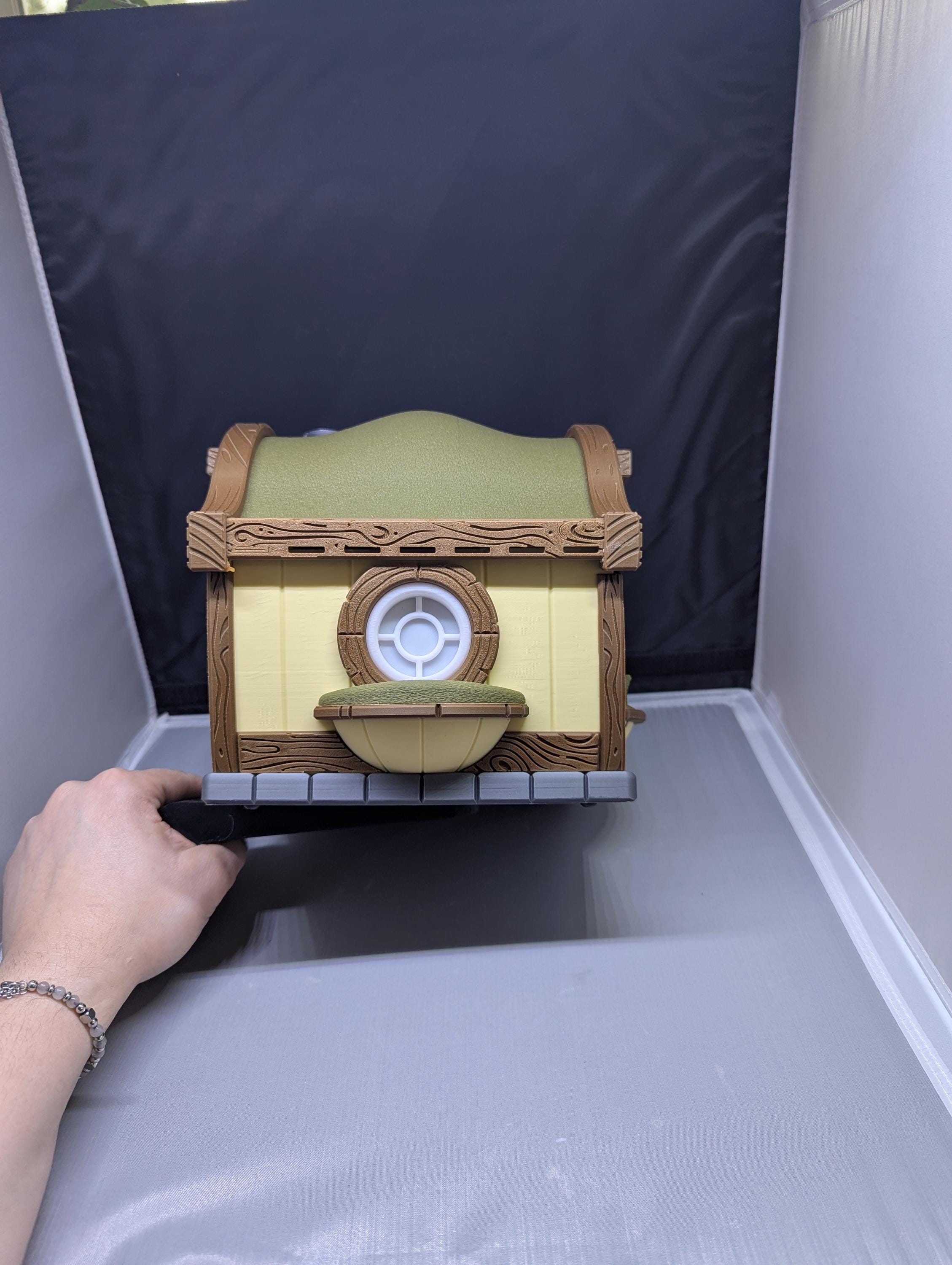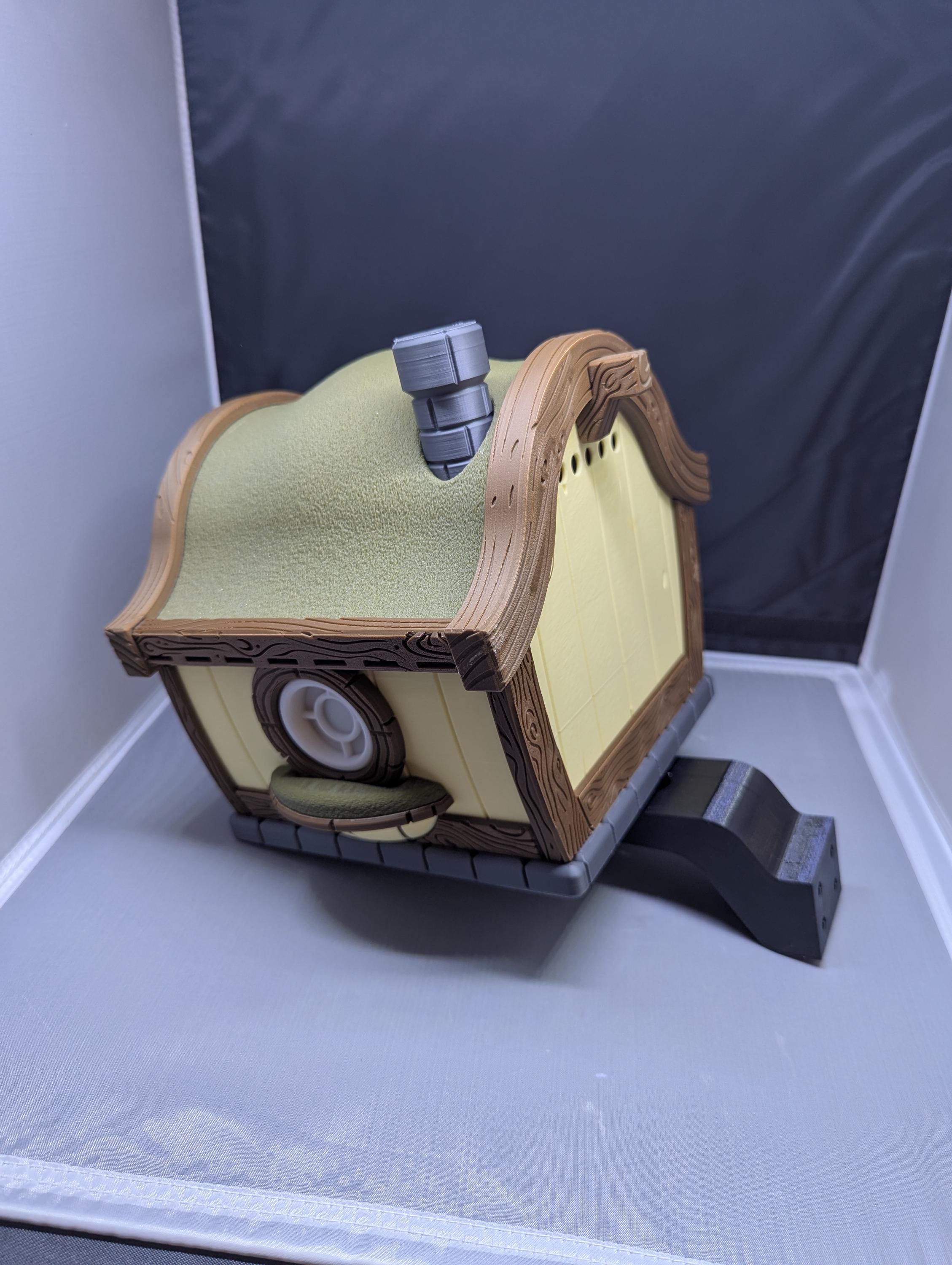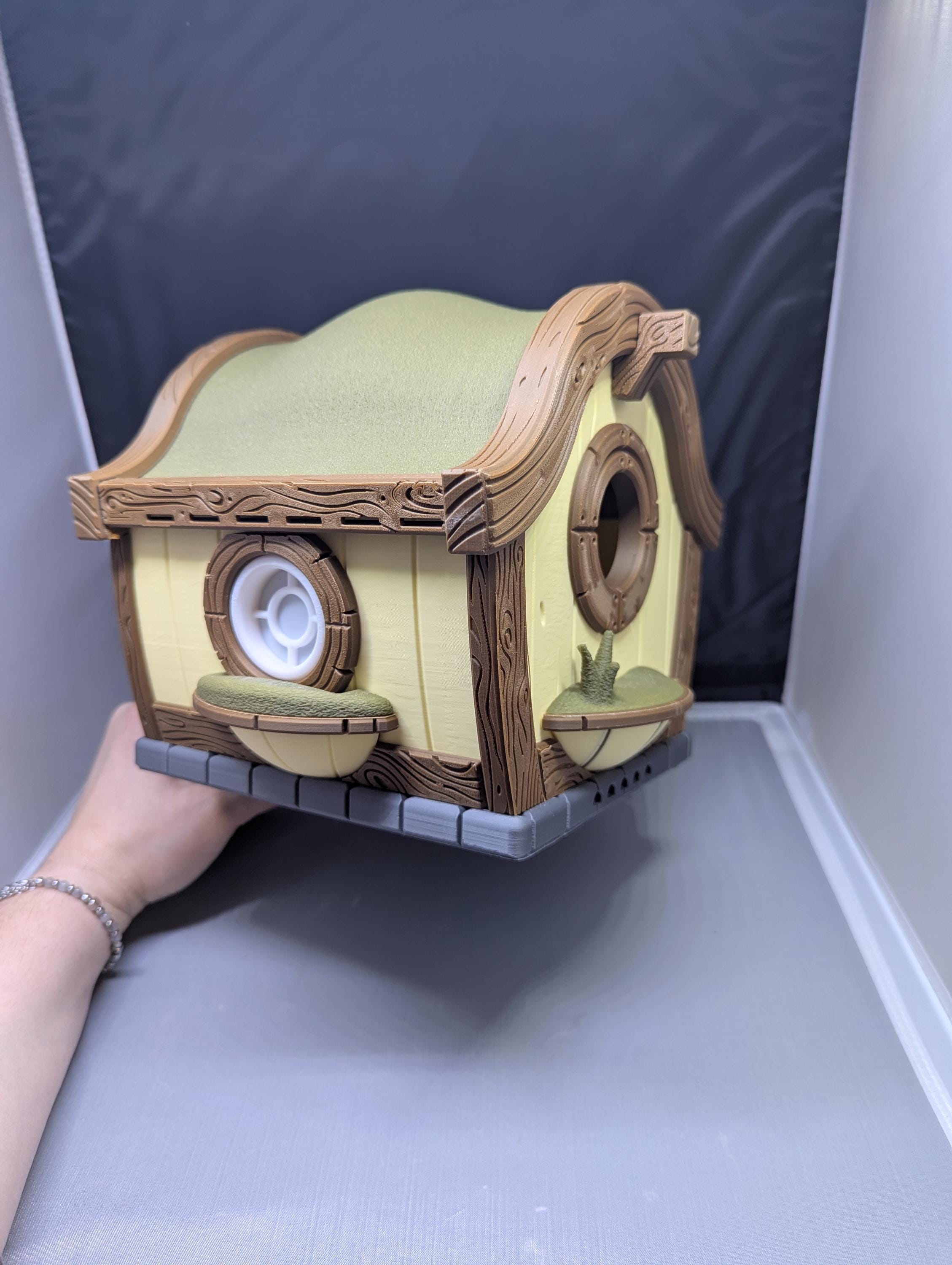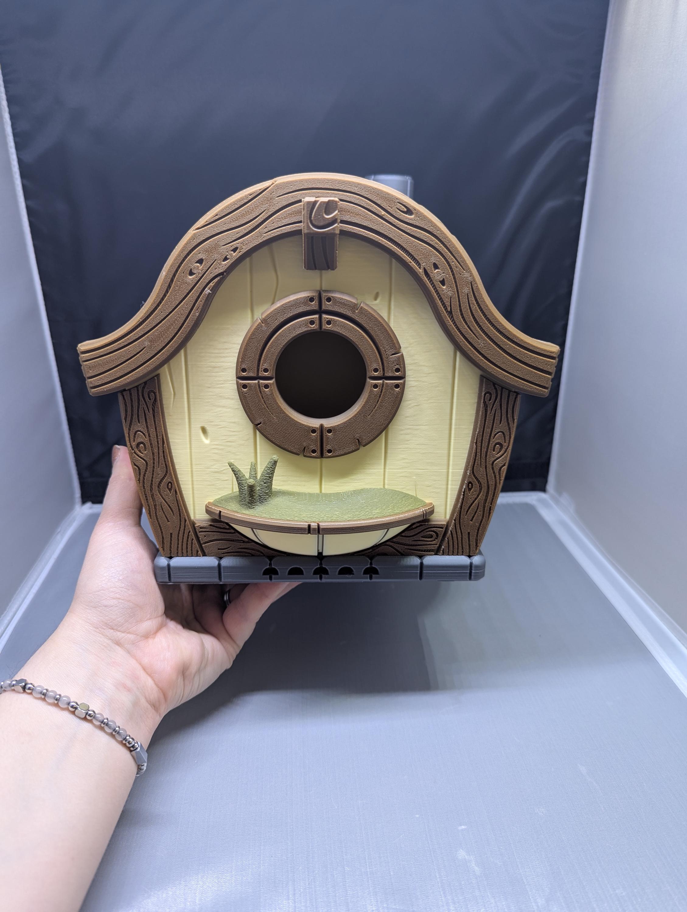 Whimsical and highly detailed. Hobbit house birdhouse includes a round door and windows, gently curving roof, chimney, and wood grain texture on trim. It's the perfect addition to any yard or garden.