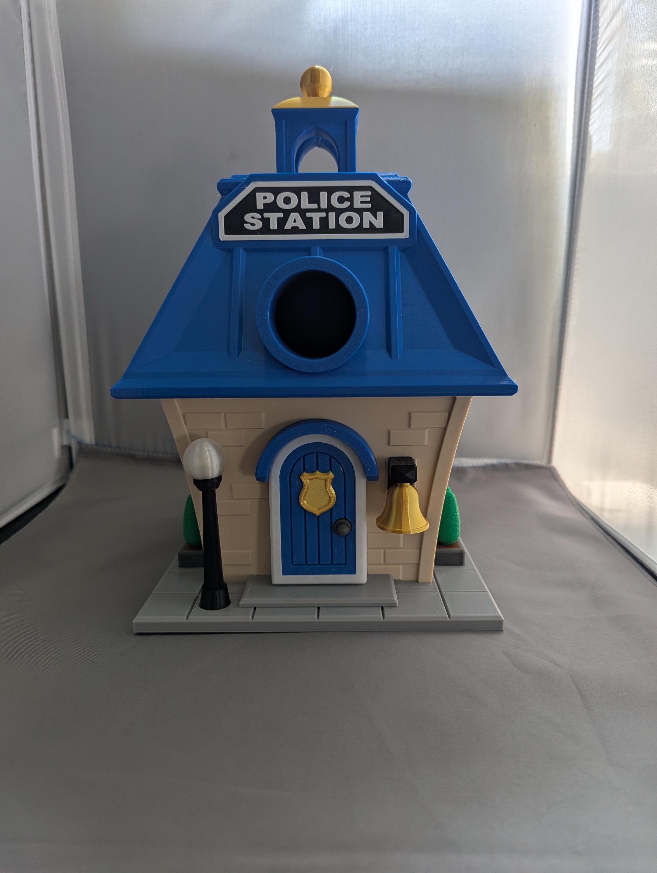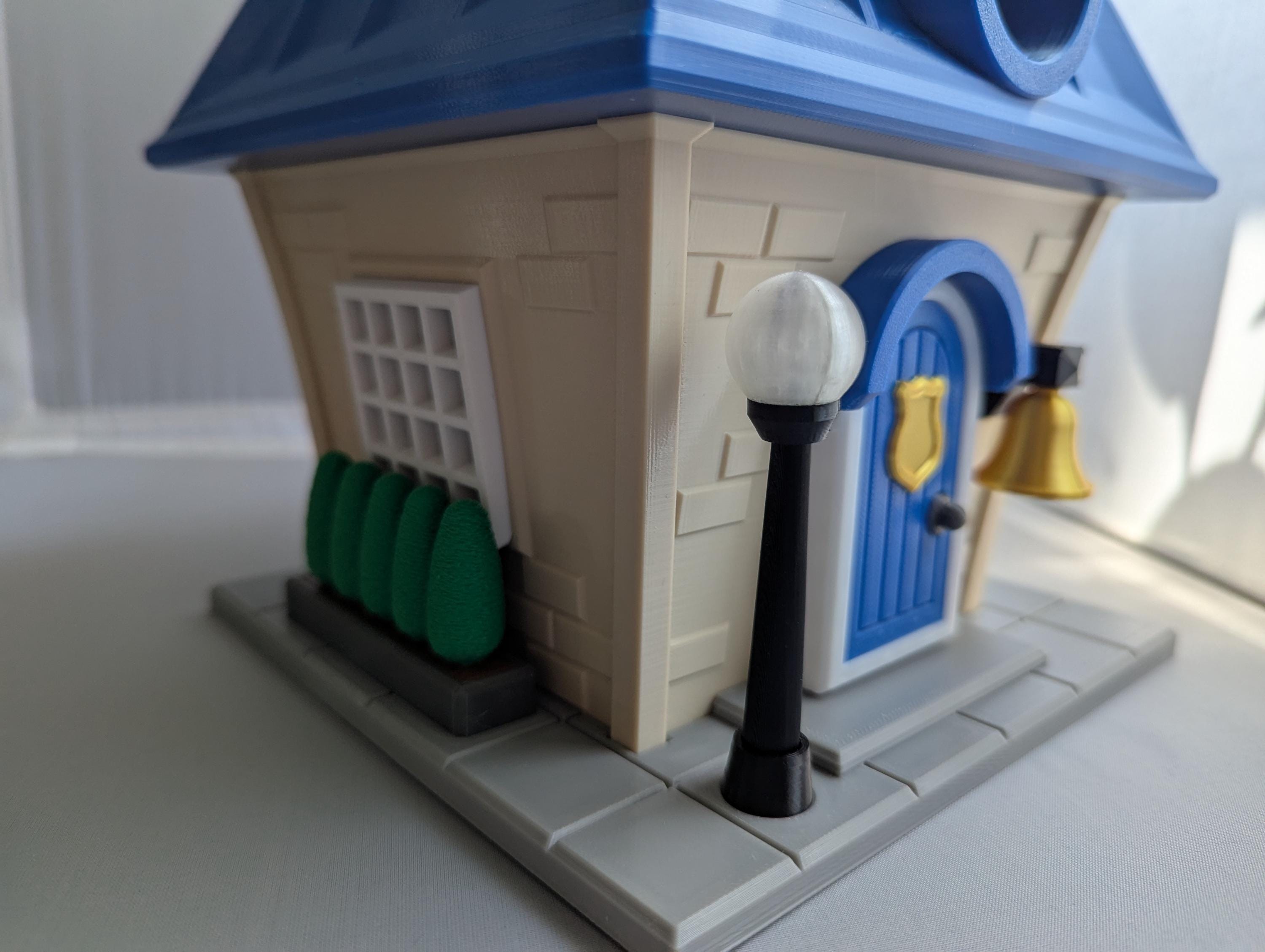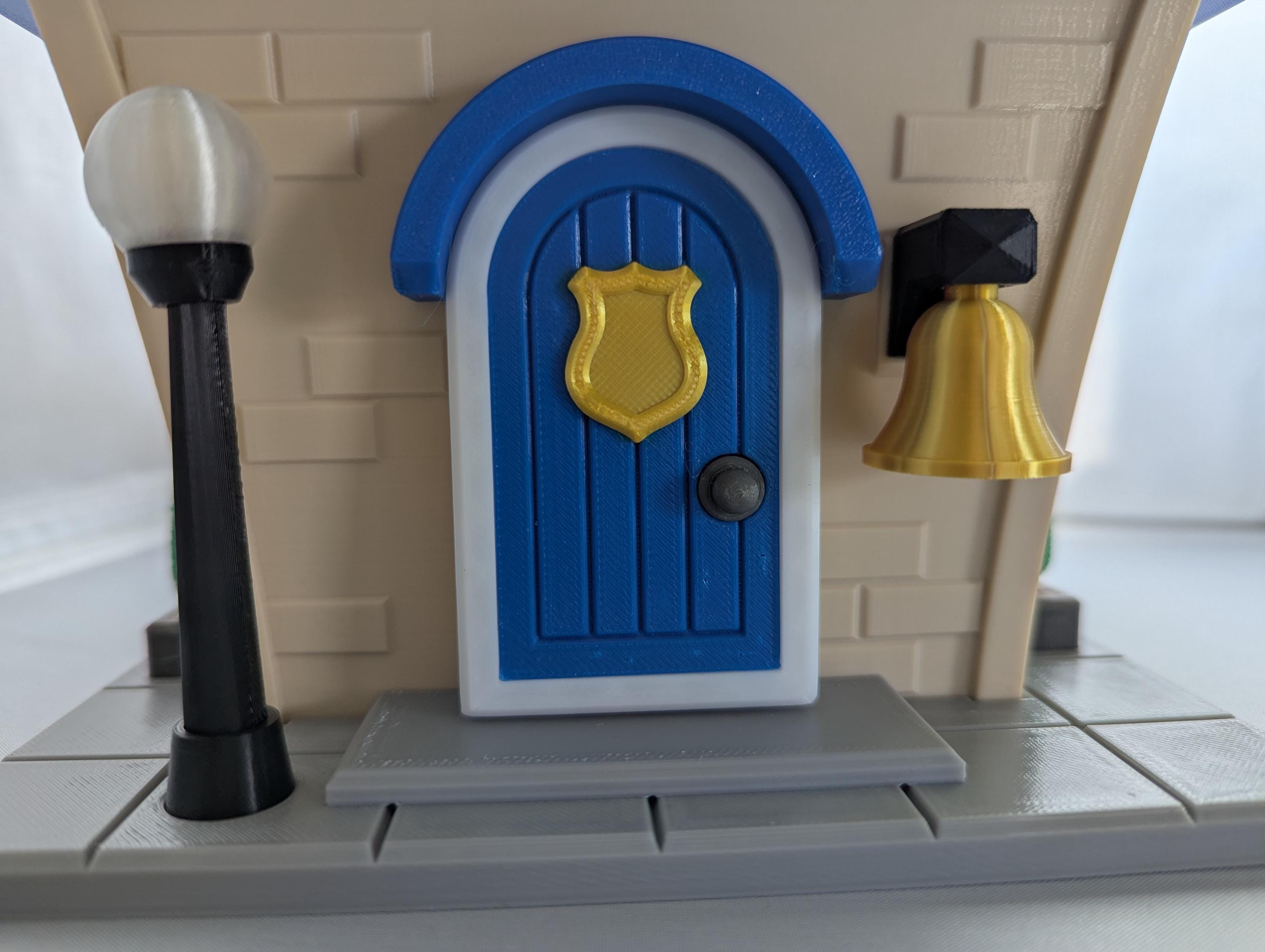 ⭐ golden bell ⭐ lightpost ⭐ shrub border ⭐ curved front door with shield ⭐ gold-topped cupola ⭐ police station sign