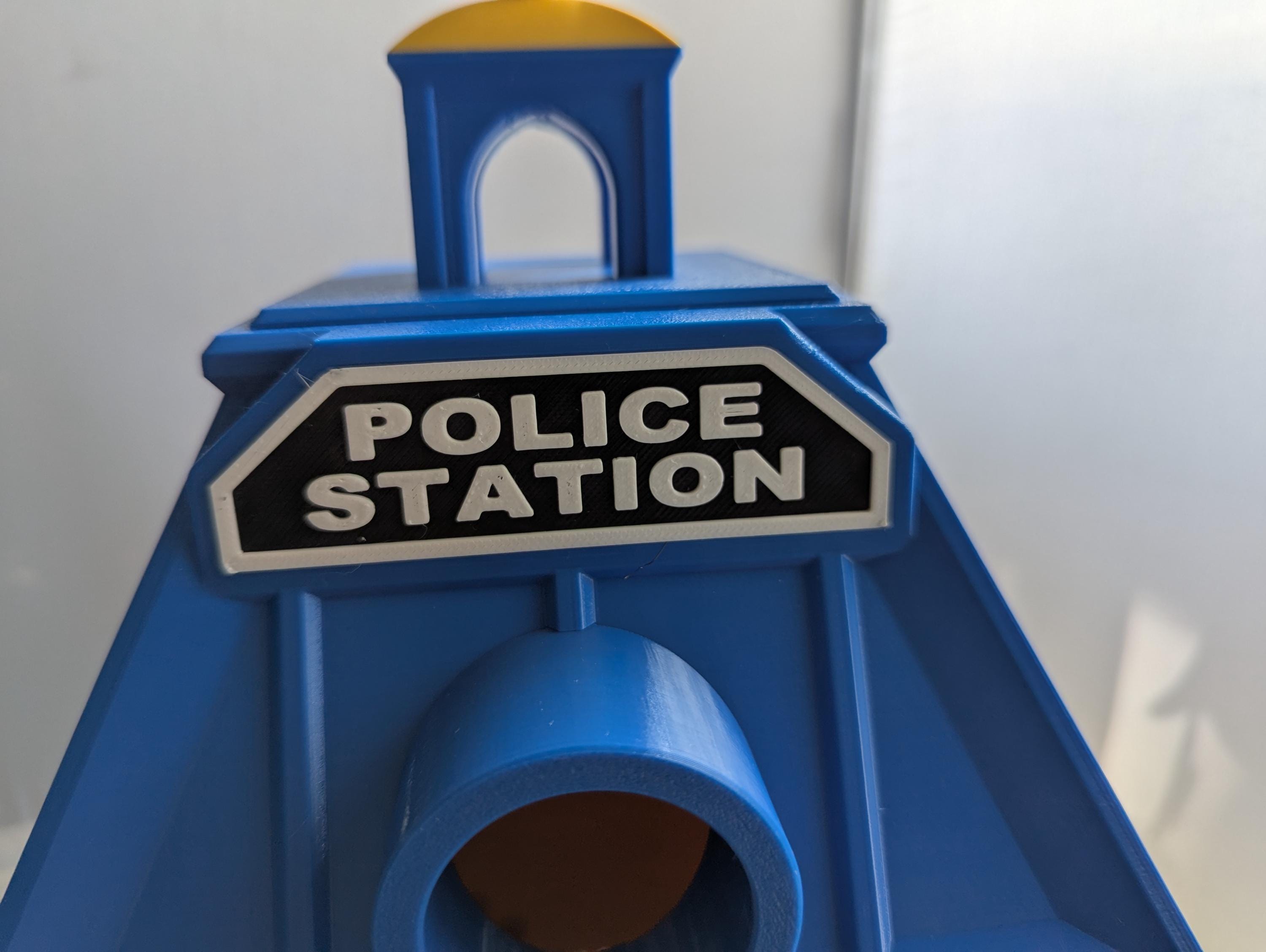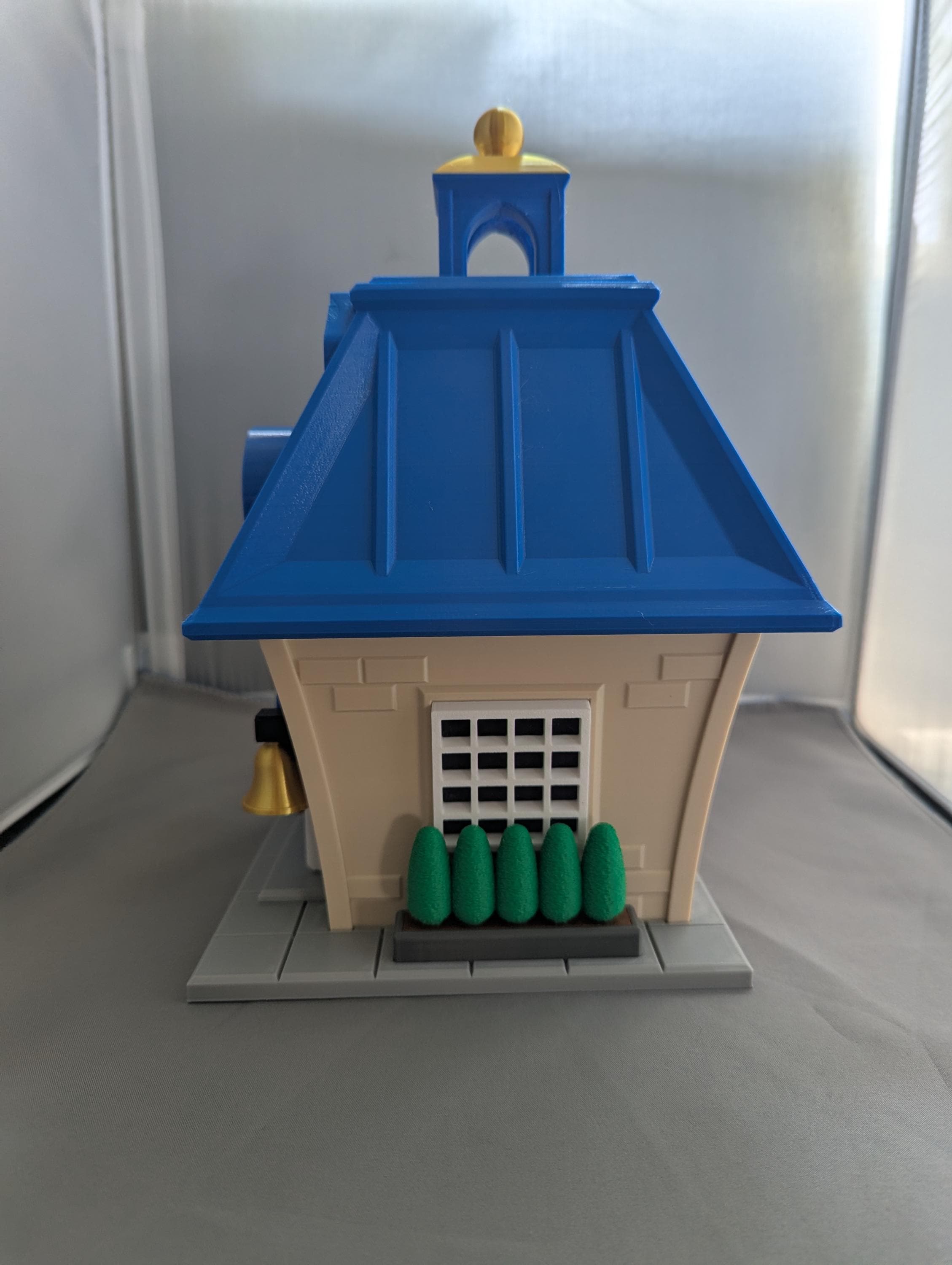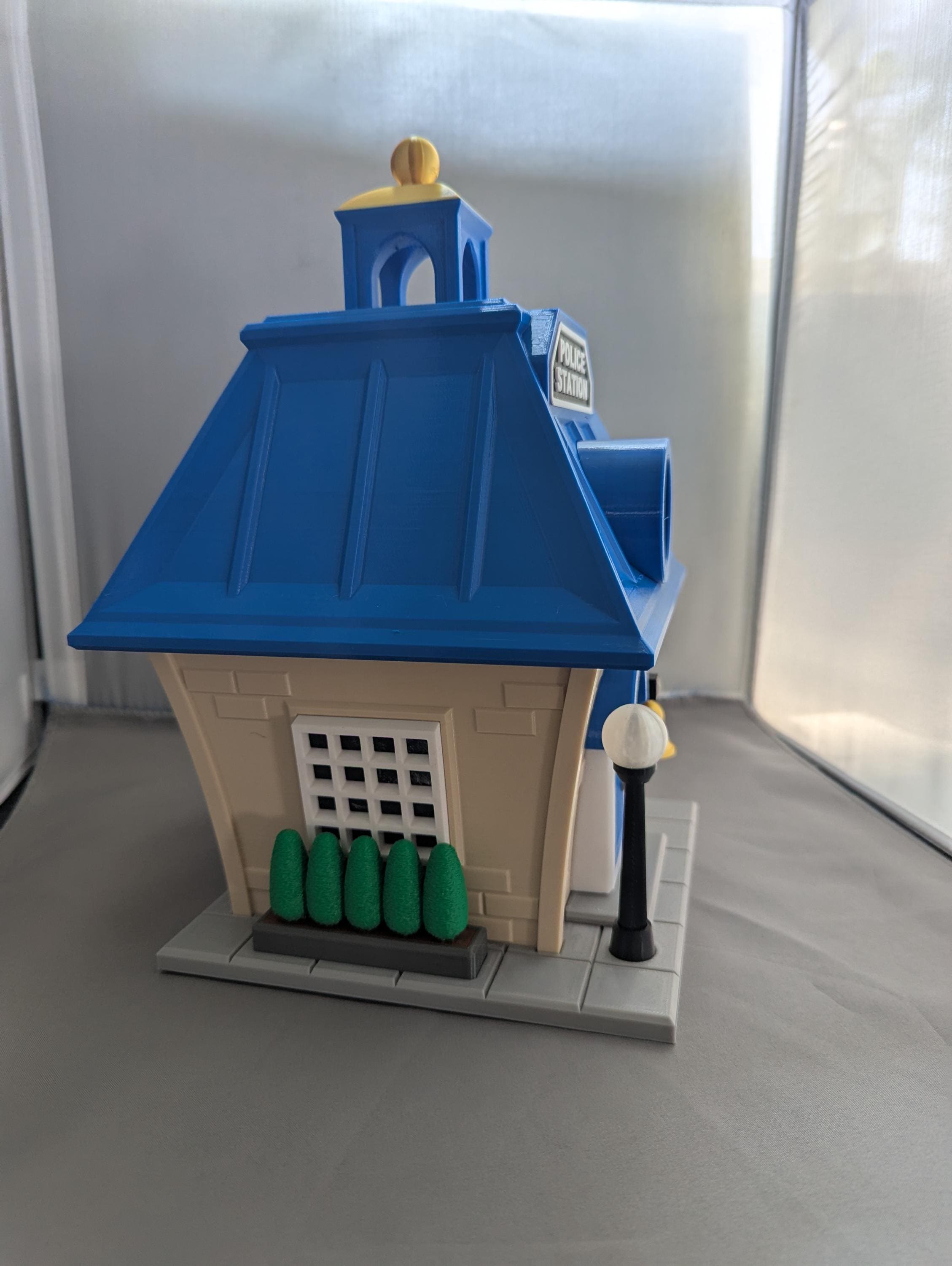 ⭐ golden bell ⭐ lightpost ⭐ shrub border ⭐ curved front door with shield ⭐ gold-topped cupola ⭐ police station sign