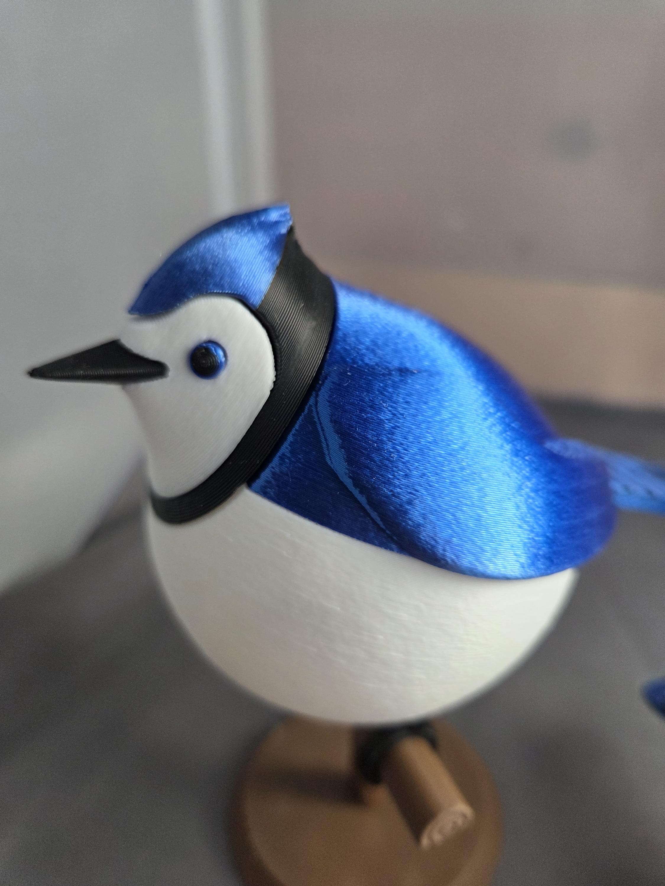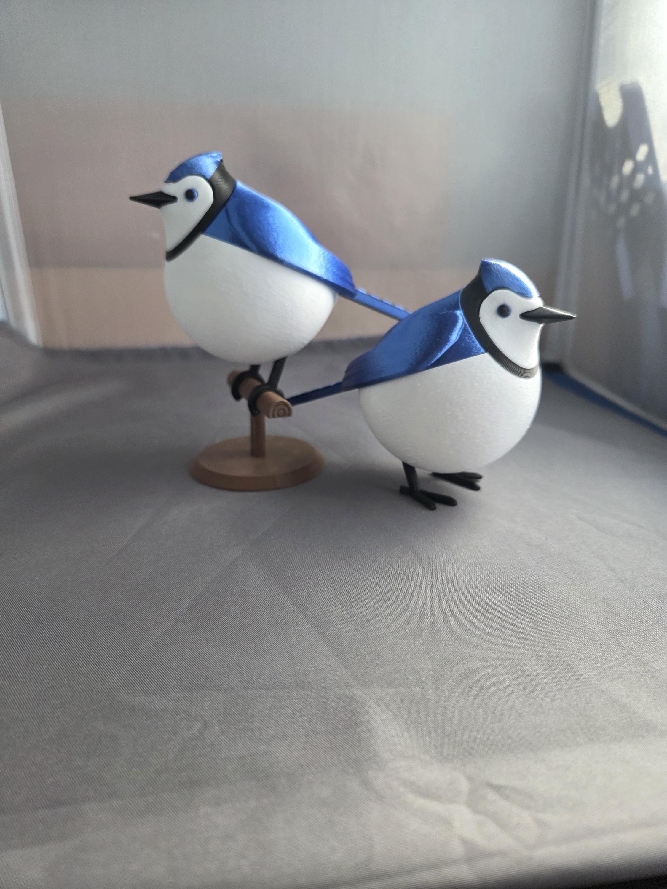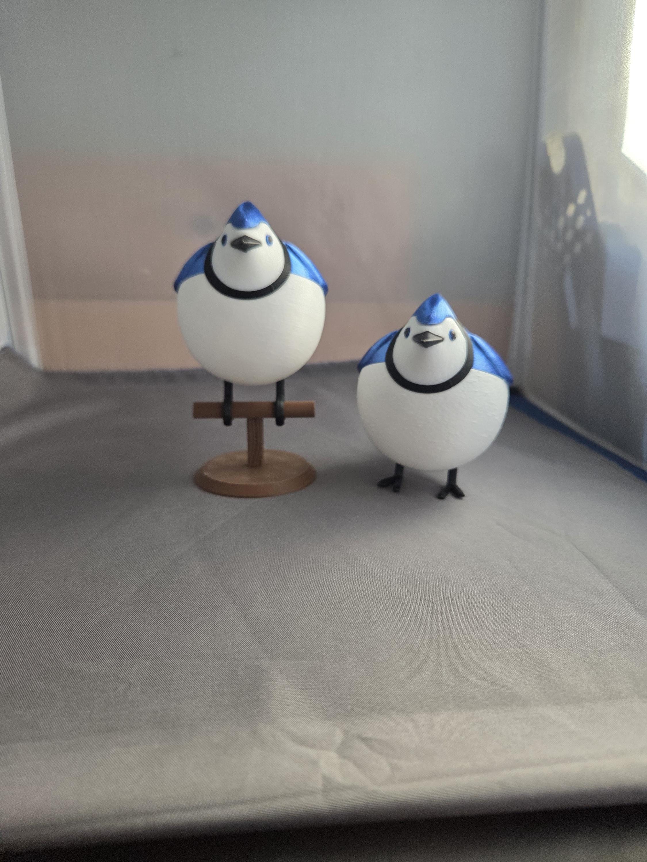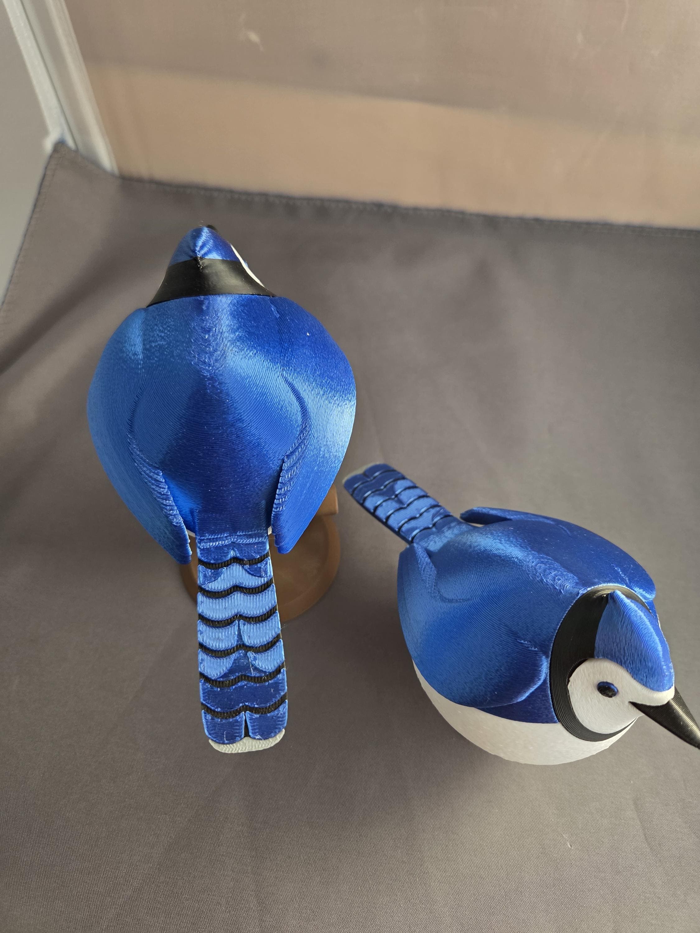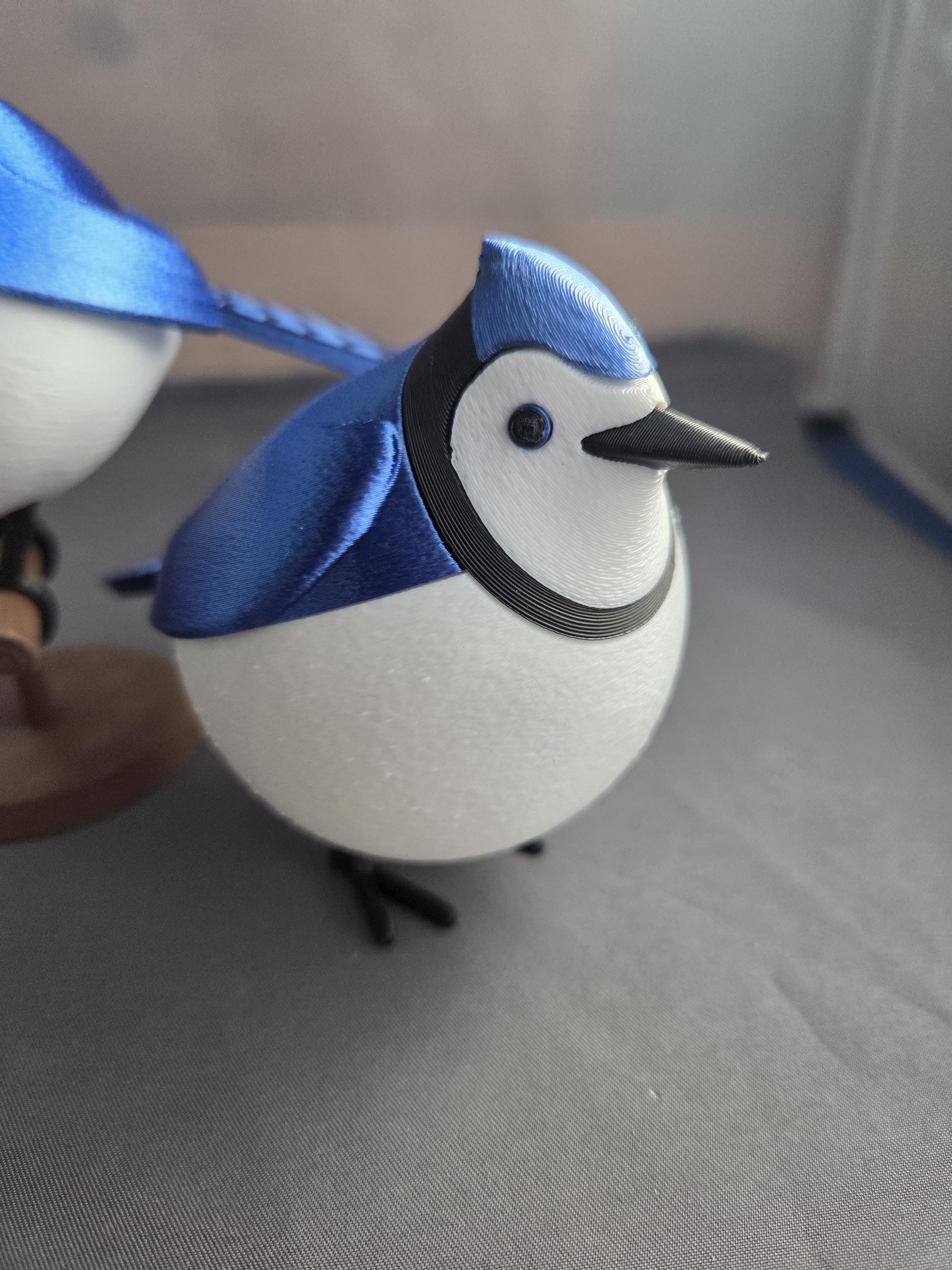 Tabletop bird decoration looks like a fluffy Blue Jay. Choose freestanding bird with flat feet to stand on a table, or curved feet to sit on the included perch. (note: freestanding bird does not come with perch)