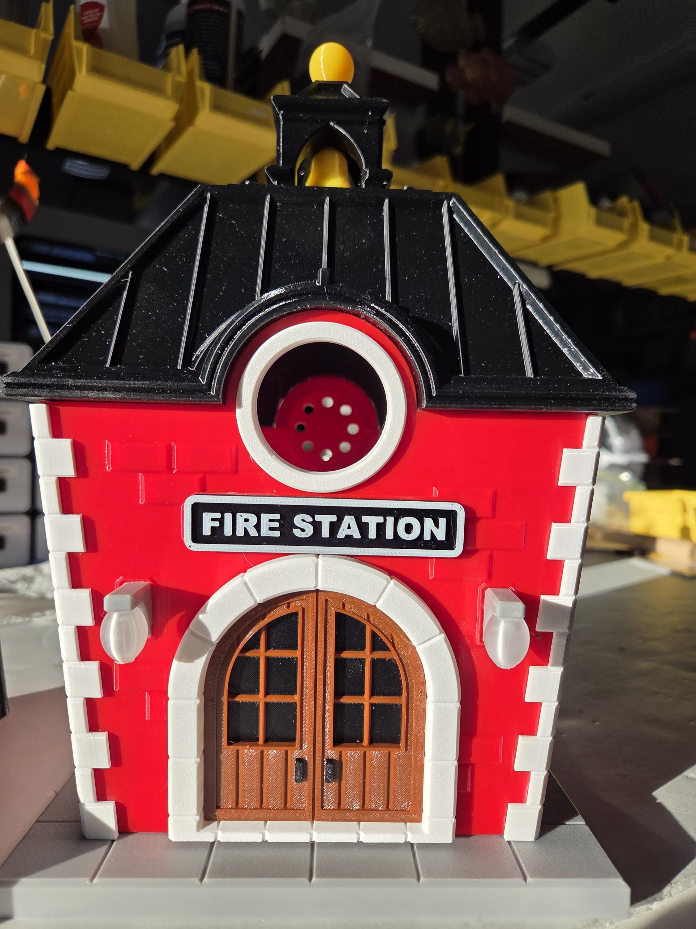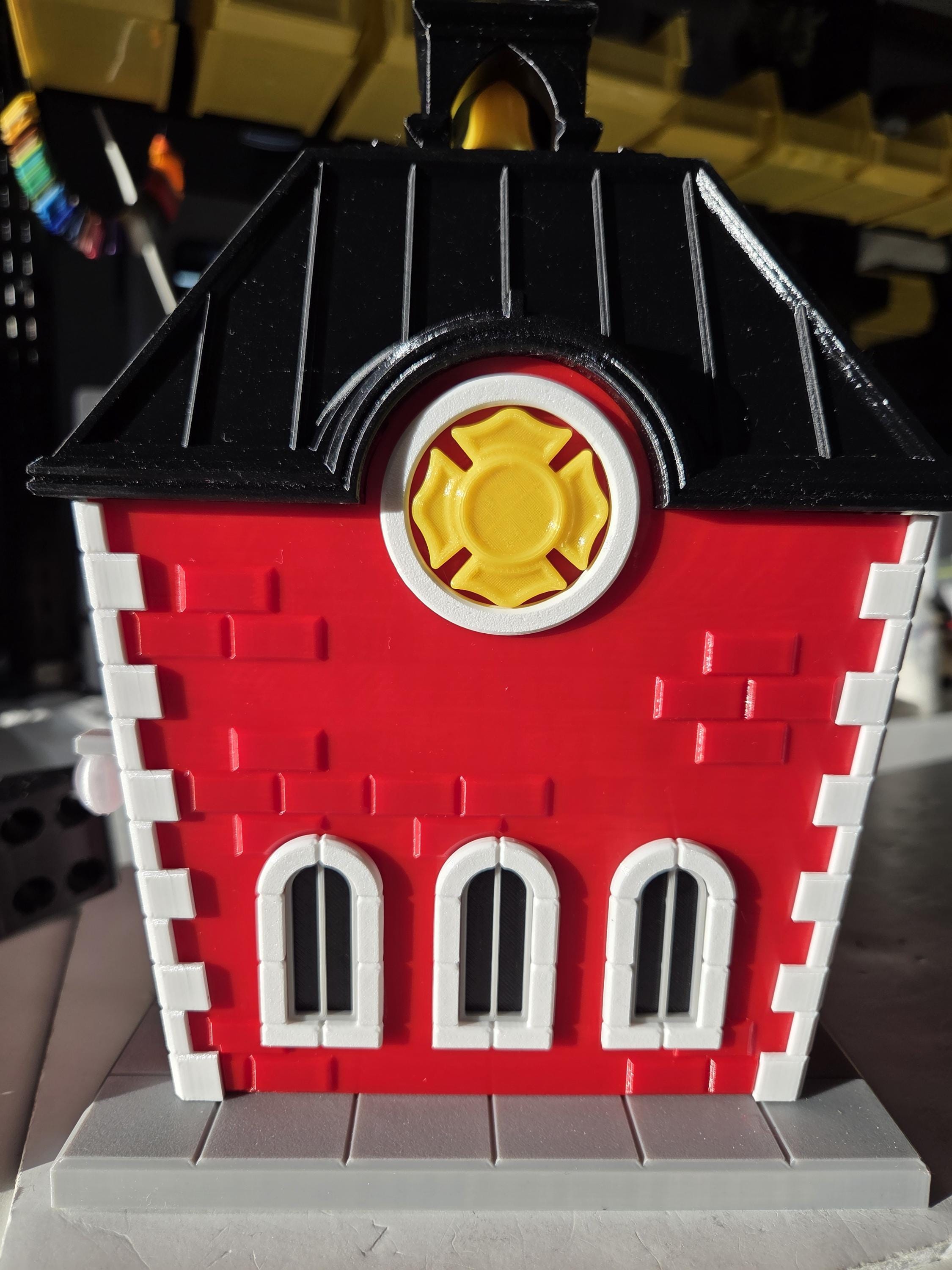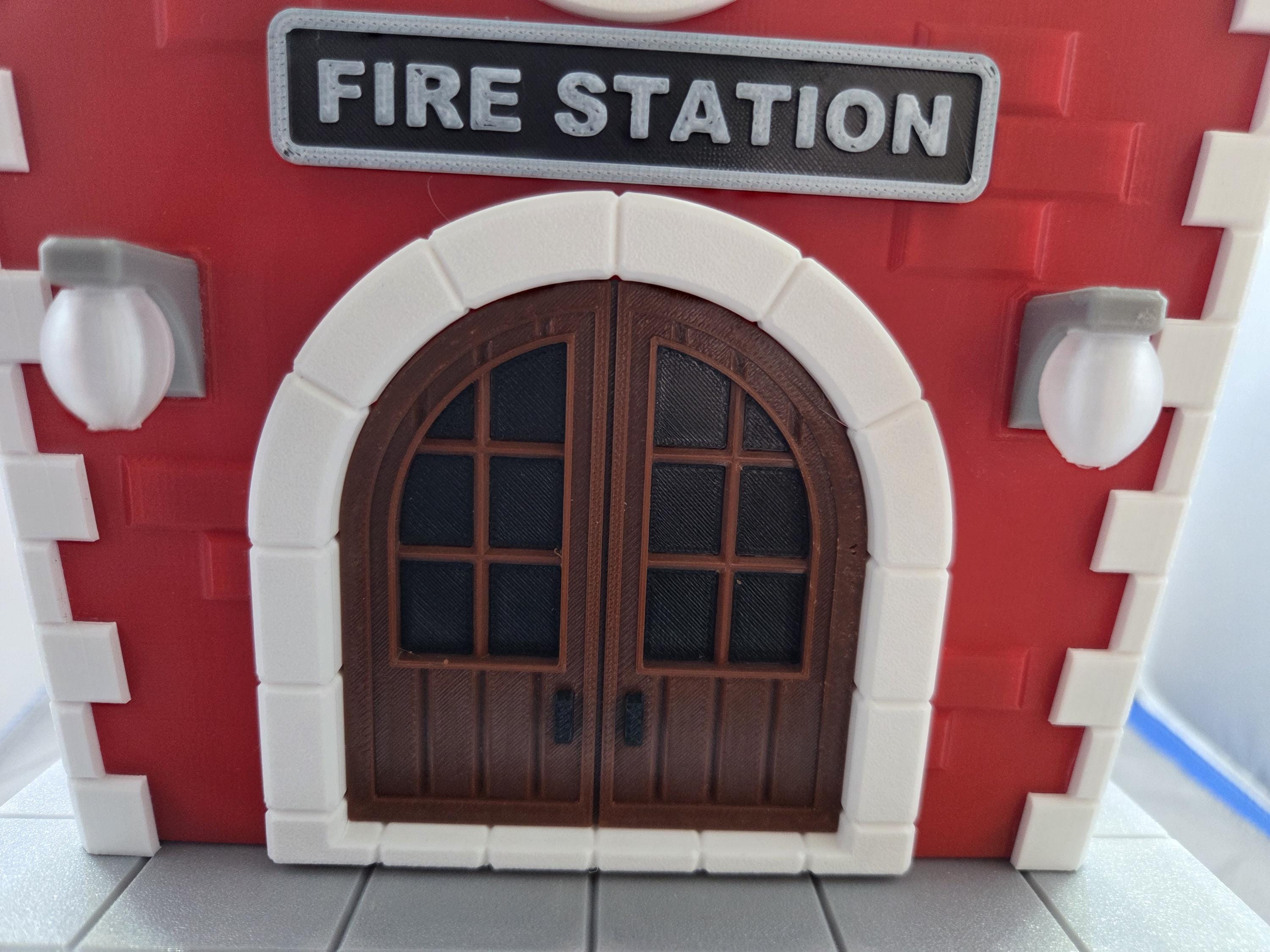 ⭐ golden bell ⭐ globe lights ⭐ Fire Fighters Cross ⭐ curved front door ⭐ gold-topped cupola ⭐ Fire station sign