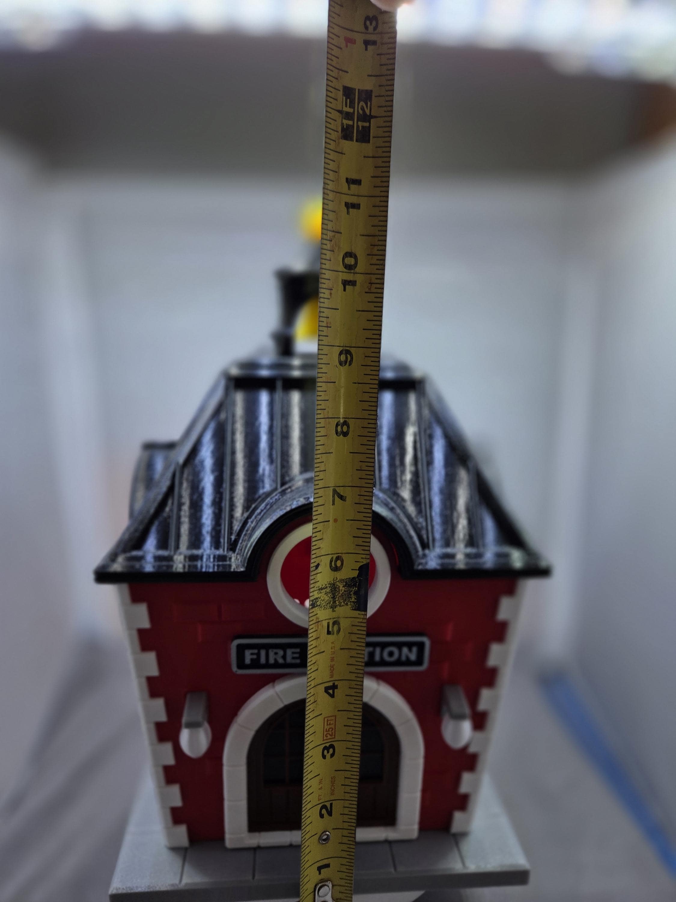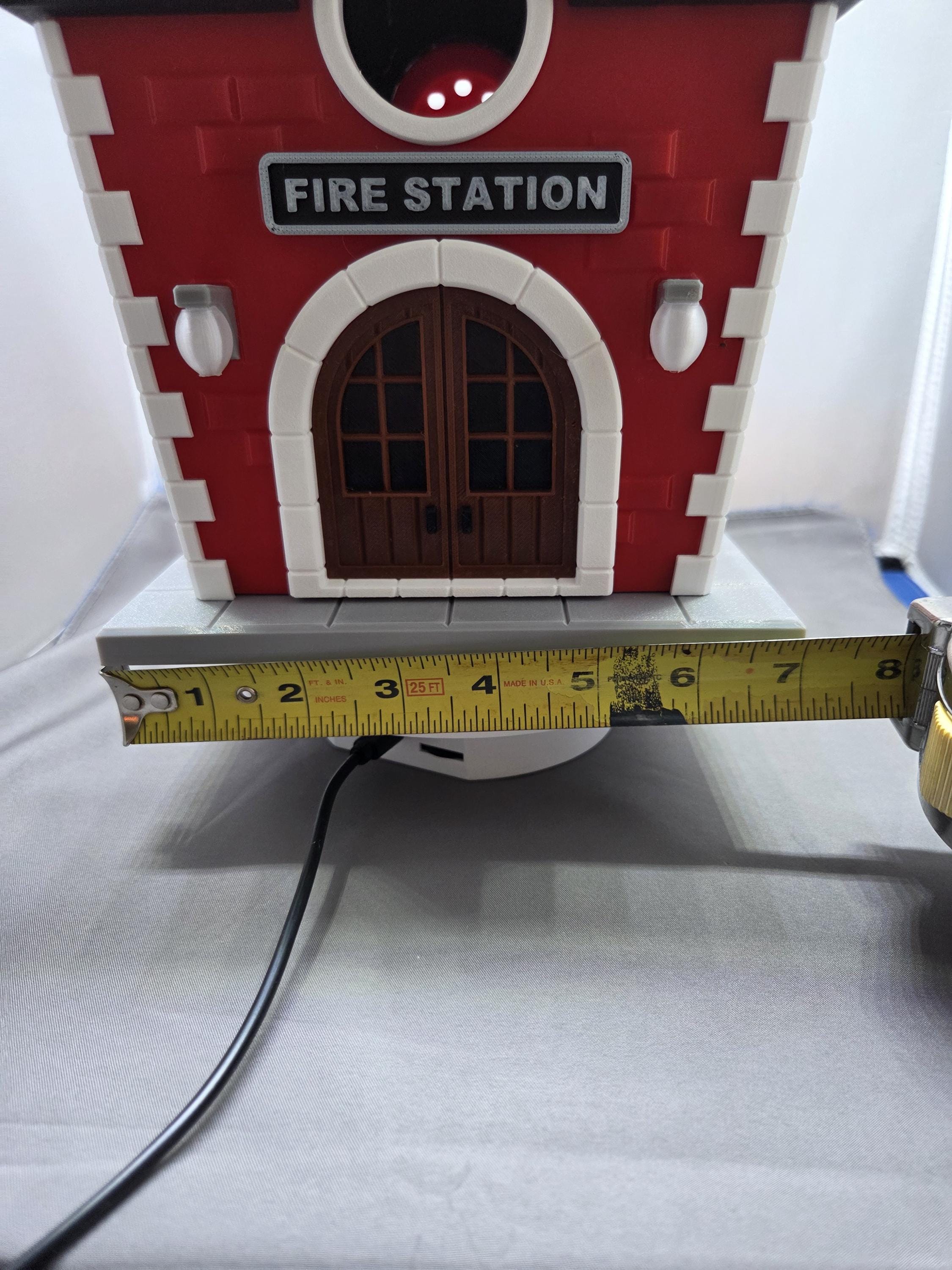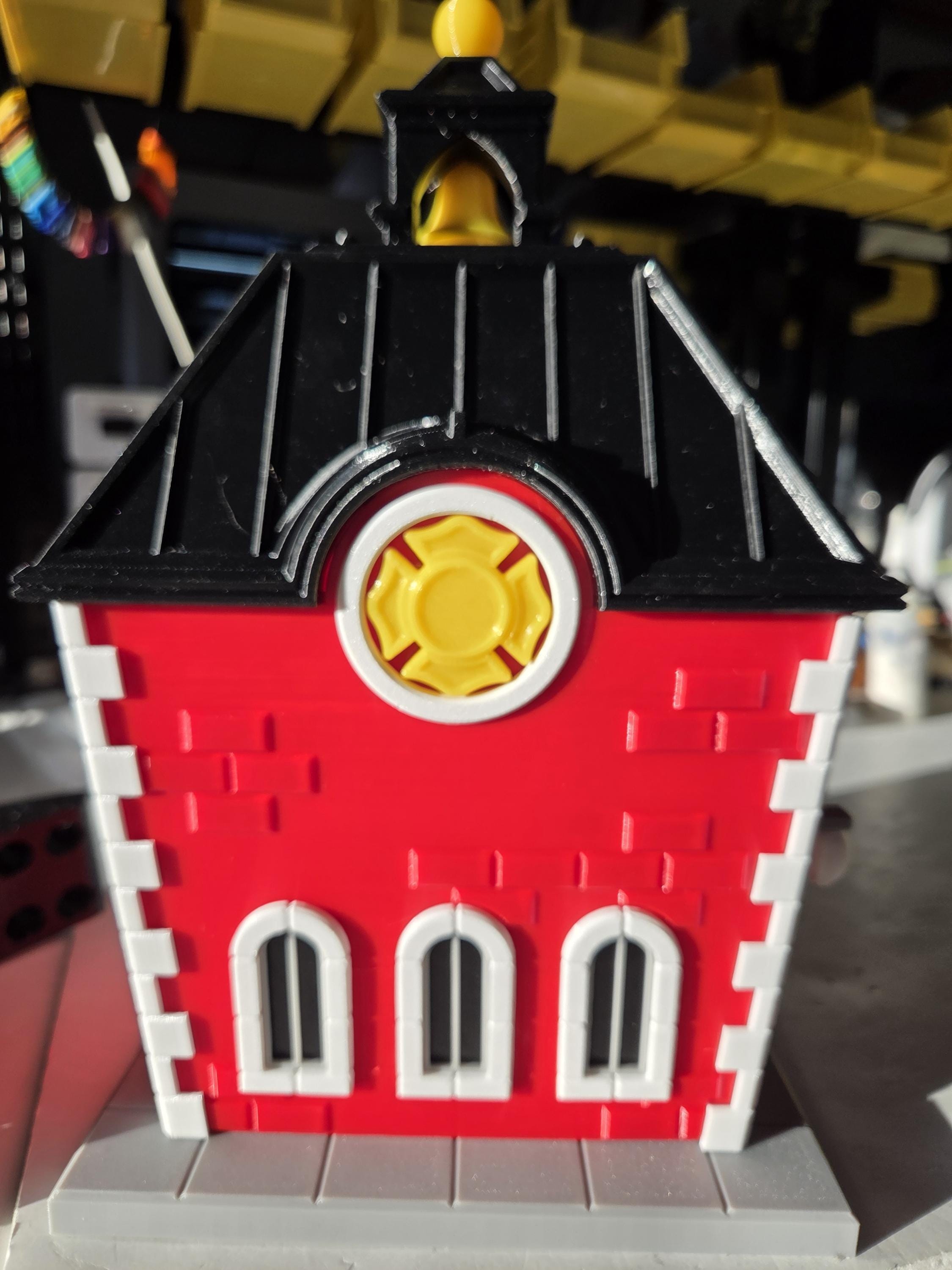 ⭐ golden bell ⭐ globe lights ⭐ Fire Fighters Cross ⭐ curved front door ⭐ gold-topped cupola ⭐ Fire station sign